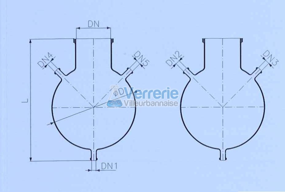 Ballon reacteur en verre 5 litres brides DN 50 KZA vidange DN 100 PZ passage cote DN2 DN 25 KZA Diametre 220 mm longueur totale 350 mm verre industriel